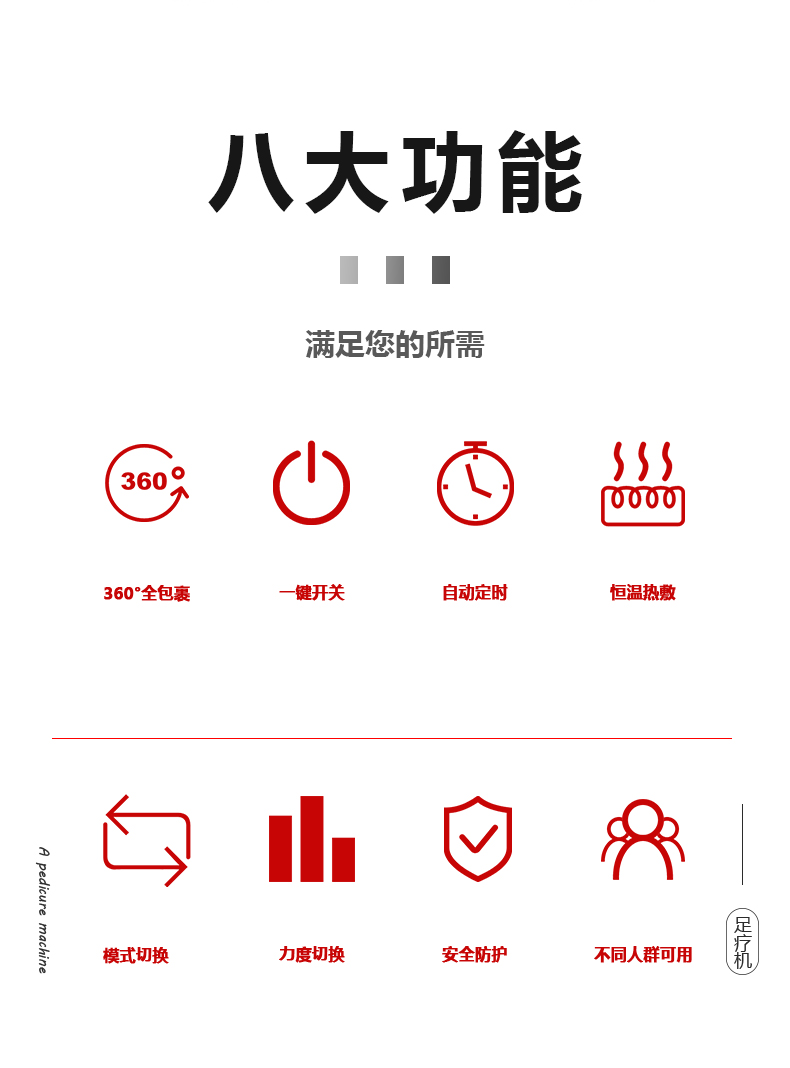 鞋底滾壓(趾),刮擦(鞋底),Shiatus(腳跟)按摩(多模式,多強度)