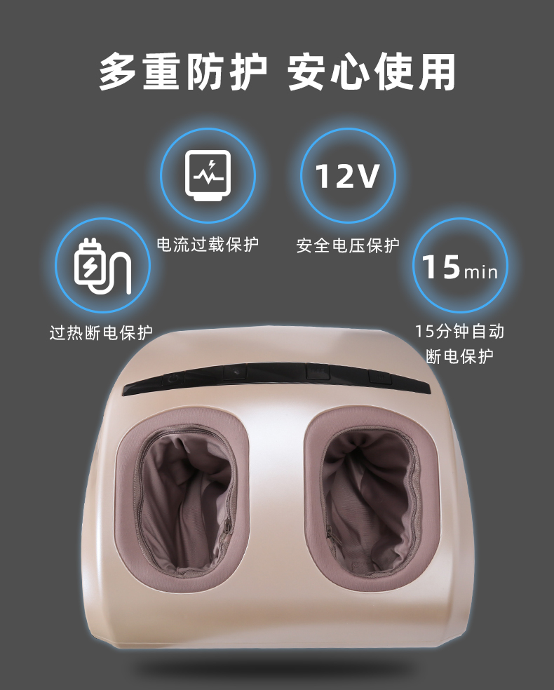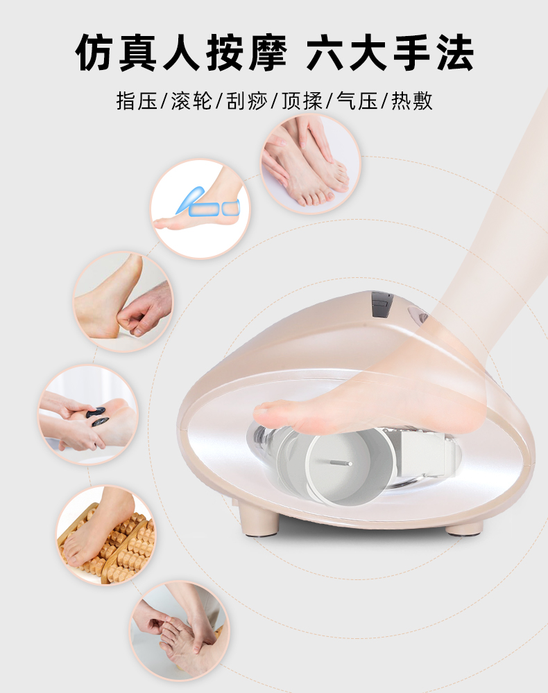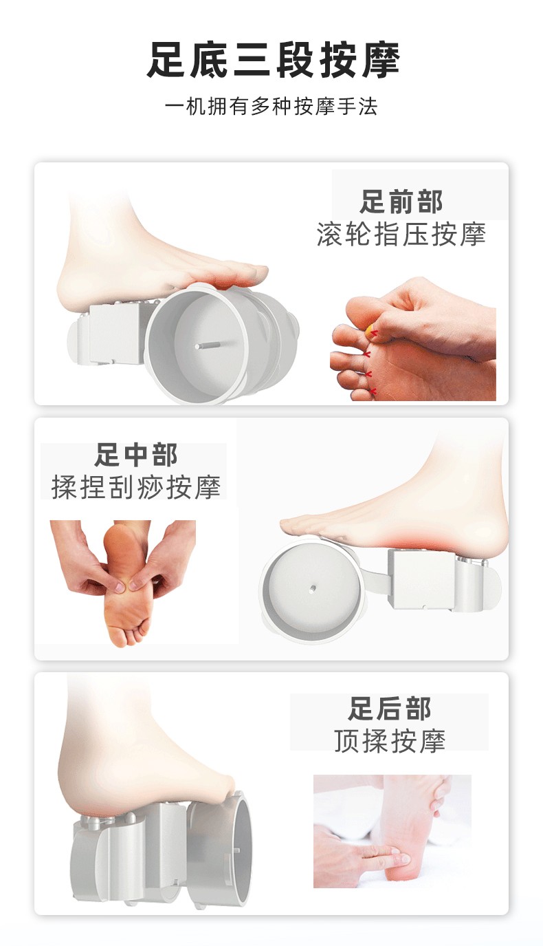 功能特征:腳底滾壓、刮痧、氣囊擠壓三段式按摩,2擋力度調(diào)節(jié),3種模式選擇,